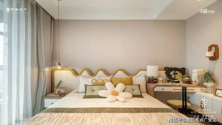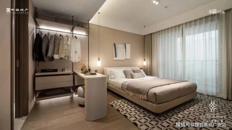 全屋约14.6米大面宽的尺度,让三个卧室都能够直面南向采光,实现阳光平权。主卧是豪华套房,除了飘窗、独卫外,由于空间够大,不论是衣帽间的梳妆打扮,临时办公等,也都能在主卧空间内实现。