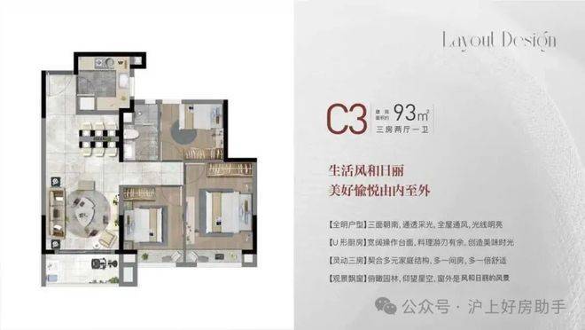 建面约93㎡3房2厅1卫,做到了三开间朝南+双卧室带飘窗+动静分离,室内通透明亮。