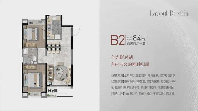 建面约84㎡2房2厅1卫,做到了双开间朝南+双卧室带飘窗+动静分离,非常宽敞的2房户型。