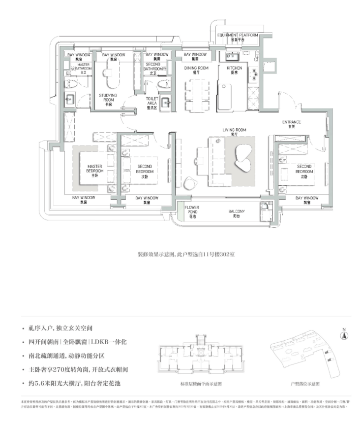 四开间朝南,面宽达约15.5米,罕见七飘窗设置,主卧还是约270°转角飘窗。