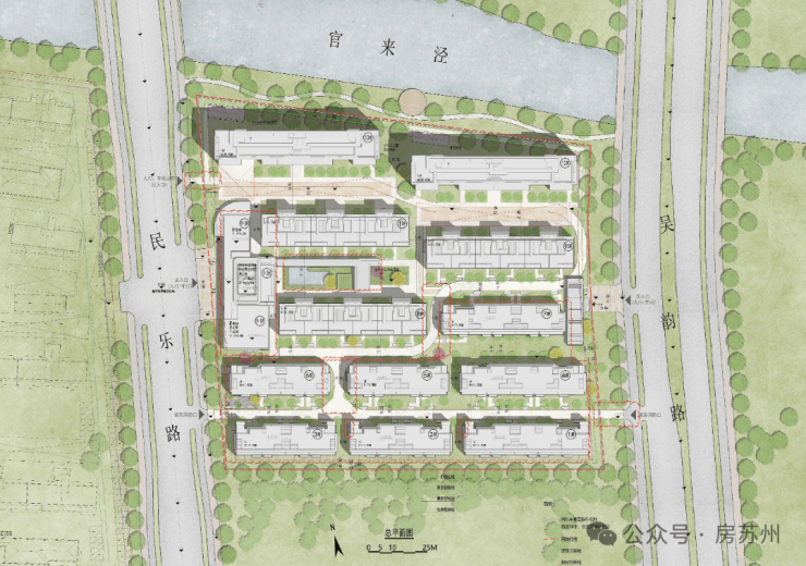 整个项目南低北高分布,将采光优势发挥到极致;在出入口设计上,主入口设在西侧民乐路,次入口位于东侧吴韵路,双向便捷通行,既保证了归家的从容,又兼顾了生活的高效。