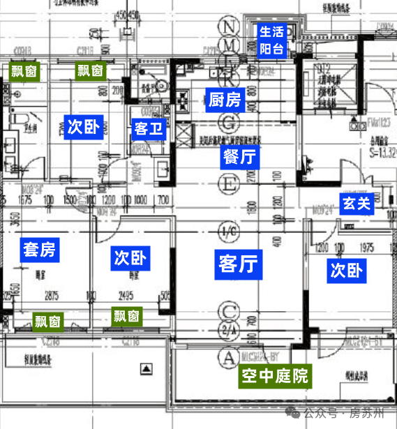 室内动静分区,公区厨餐客+约30平空中庭院+生活阳台的组合;静区三房朝南,一房朝北,双套房,卫生间全明卫。