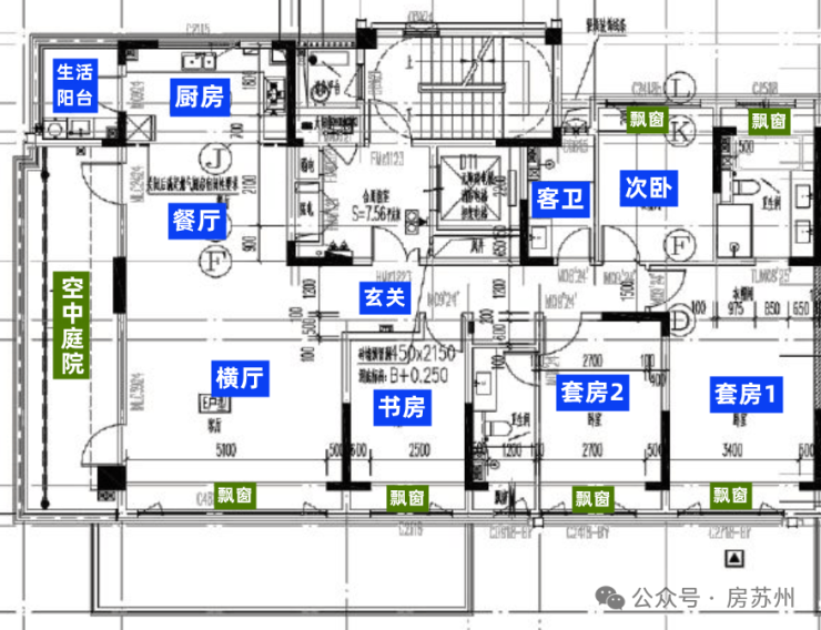 F户型测算面积约156平,中间户,一梯两户。室内是4房2卫,三房朝南,朝南带一个20-23平的空中庭院,朝北带生活阳台;