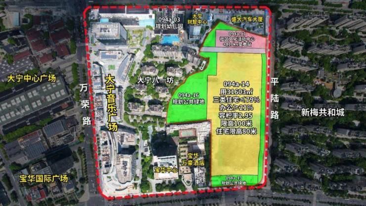 该项目位于大宁公园北侧、东临新梅共和城,占地面积约31603㎡,容积率2.95,限高100米(住宅高度不超高80米),计容面积约93229㎡,其中住宅占比≤79%,办公占比≥21%。