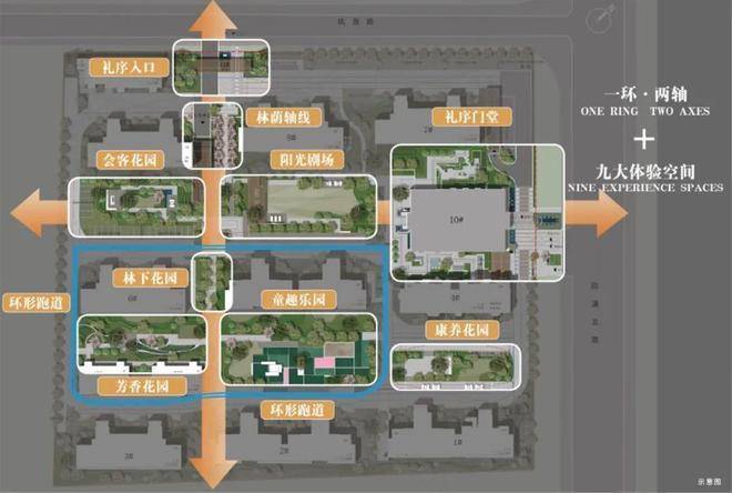 锦上和风通过“一环两轴九大空间”布局,把森林公园元素融入社区: