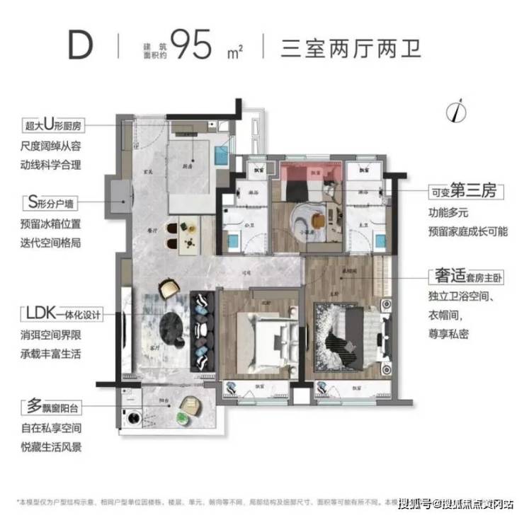 目前,朗拾花语在售的主力产品为建筑面积约92㎡房源和建筑面积约95㎡房源。其中,建筑面积约92㎡户型毛坯房源可实现创新三房变两房的设计,打造百平内约6m大横厅,30㎡的客厅创造150㎡大宅的厅堂尺度,LDK一体化、一体主卧套房设计等等,空间感与收纳感更是让人惊艳,无可挑剔。