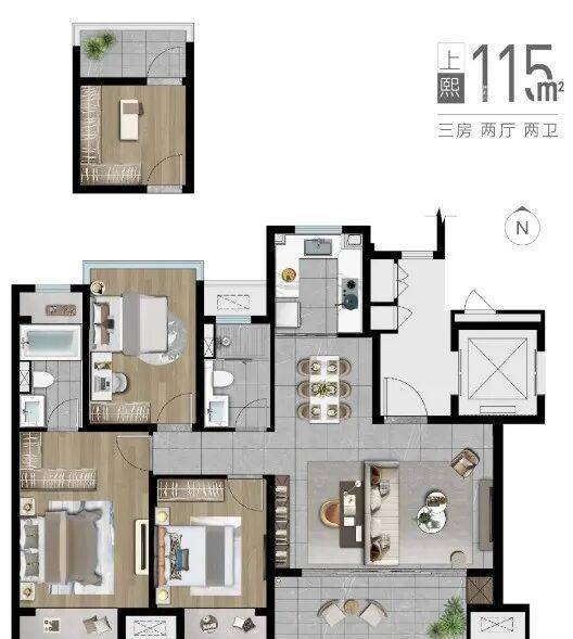 该户型还有一个亮点,就是南北双阳台的设计,北阳台既可以保留,也可以打通作为卧室、书房、游戏室,根据业主的需求,随心而定。