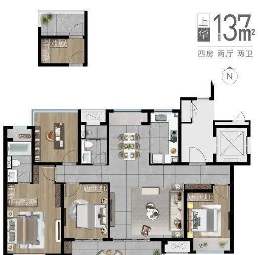 该户型可以说是改善一步到位,四室两厅两卫的格局,南开间约14.5米,三主卧朝南,全屋飘窗,双联阳台,保证了更优的采光通风效果。