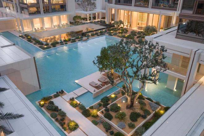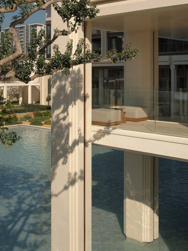 作为首个度假风情的住区,璟逸汲取希腊安缦酒店与Gundari度假村的精髓。素雅的米白石壁墙引领访客,穿行于水院与连廊之间,步入白色莱姆石建筑群,冰蓝水面与沙生植物交织的闲适景致,仿佛将圣托里尼的暖阳拥入怀中。