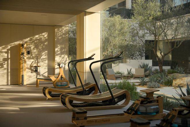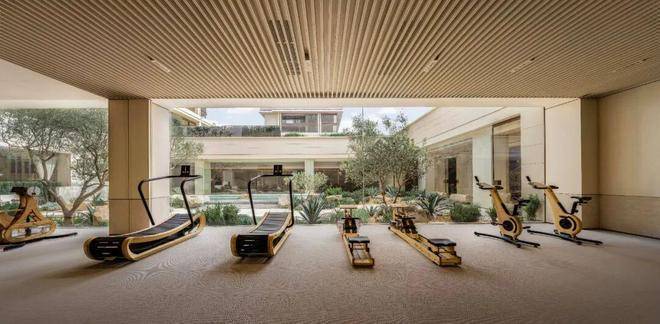 沿地下停车区步入下沉会所,私宴区、泳池区与瑜伽健身区环绕回香水庭与几何艺术绿谷。米色岛礁石、点景油橄榄与蔚蓝水韵光影交织,勾勒地中海浪情调。
