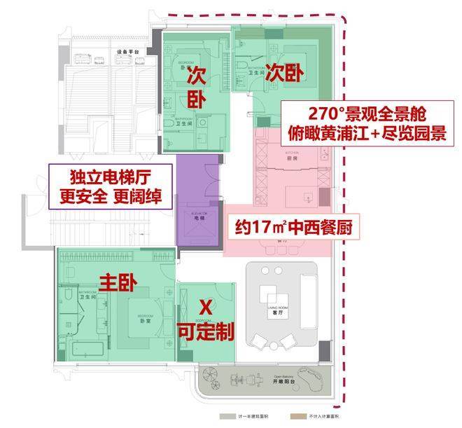 定制化:三卧室+X空间设计,主卧套房堪称家中的“小家”,临窗独立浴缸可尽享江景;