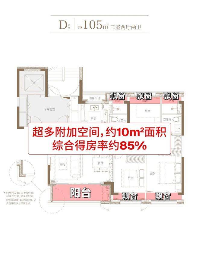 整体约10㎡附赠面积,综合得房率约85%。