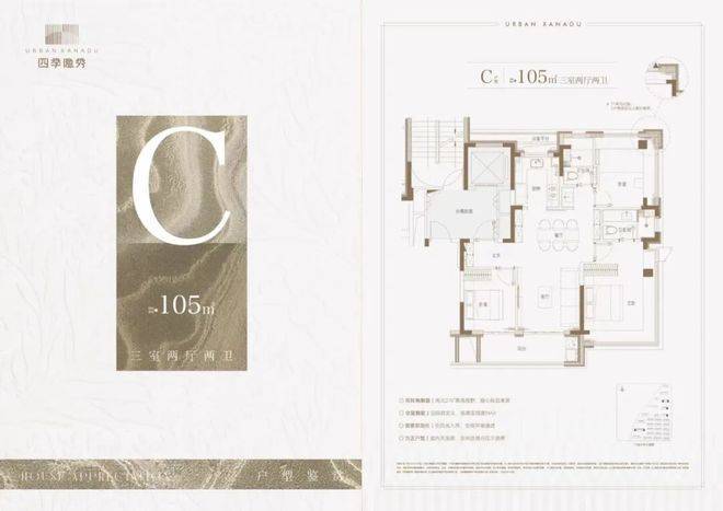 我们重点来看主力的建面约105㎡3房2卫户型: