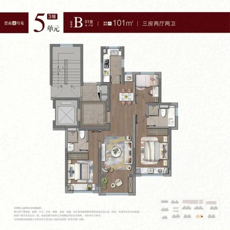 建面约100-101㎡户型,拥类独立电梯厅,无连廊+飞机户型南北通透。