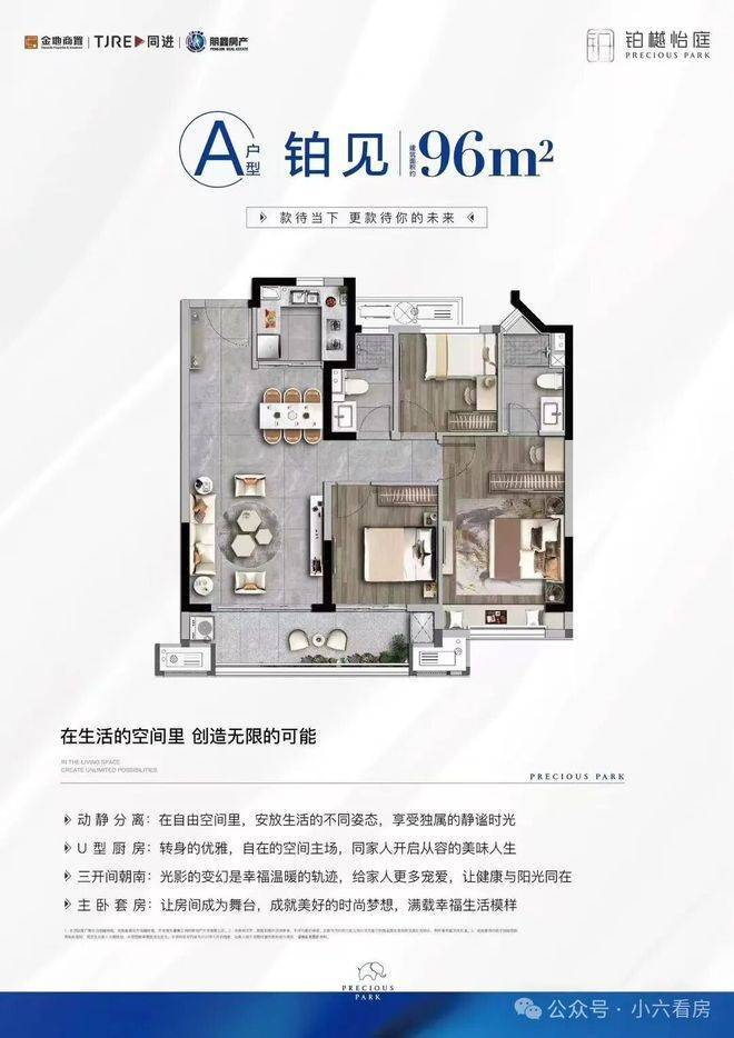 同样是三房,铂樾怡庭并没有做89㎡为客户避免0.5%的契税,而是根据居住需求,做两个卫生间,客厅做大,不压缩卧室空间,最终做到96㎡,但设计师依然觉得不够大,又做了106㎡的三房。