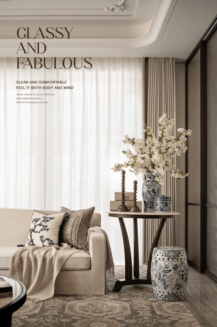 设计师利用曲线和对称式布局,勾勒出整体和细节的和谐场景。青花瓷等元素,描绘着中式艺术的浪漫。
