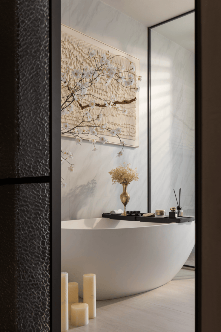空间功能也足够丰富,浴缸和一旁的梅花,增加中式浪漫主义色彩,为生活注入更多乐趣。
