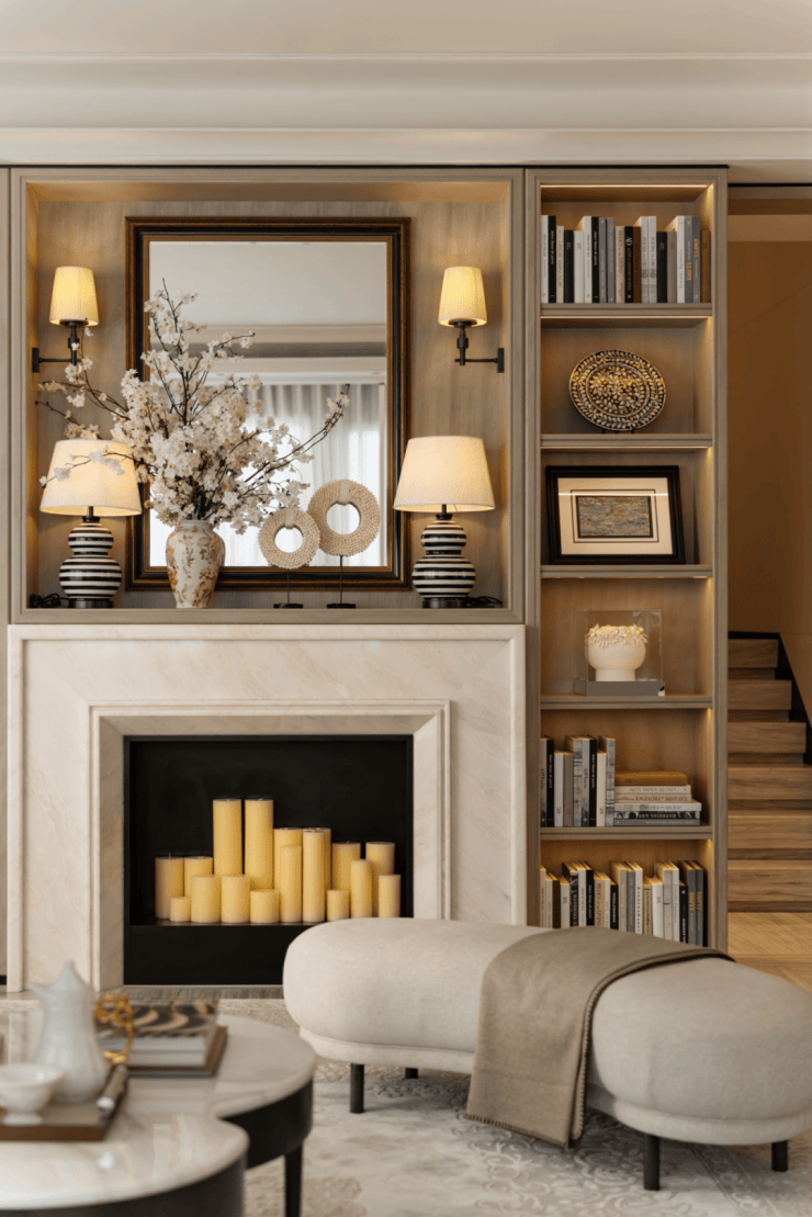 整体简约风格保持不变,细节丰富浪漫,优雅的灯具和壁炉,安静的蜡烛,都表现出优雅气息。