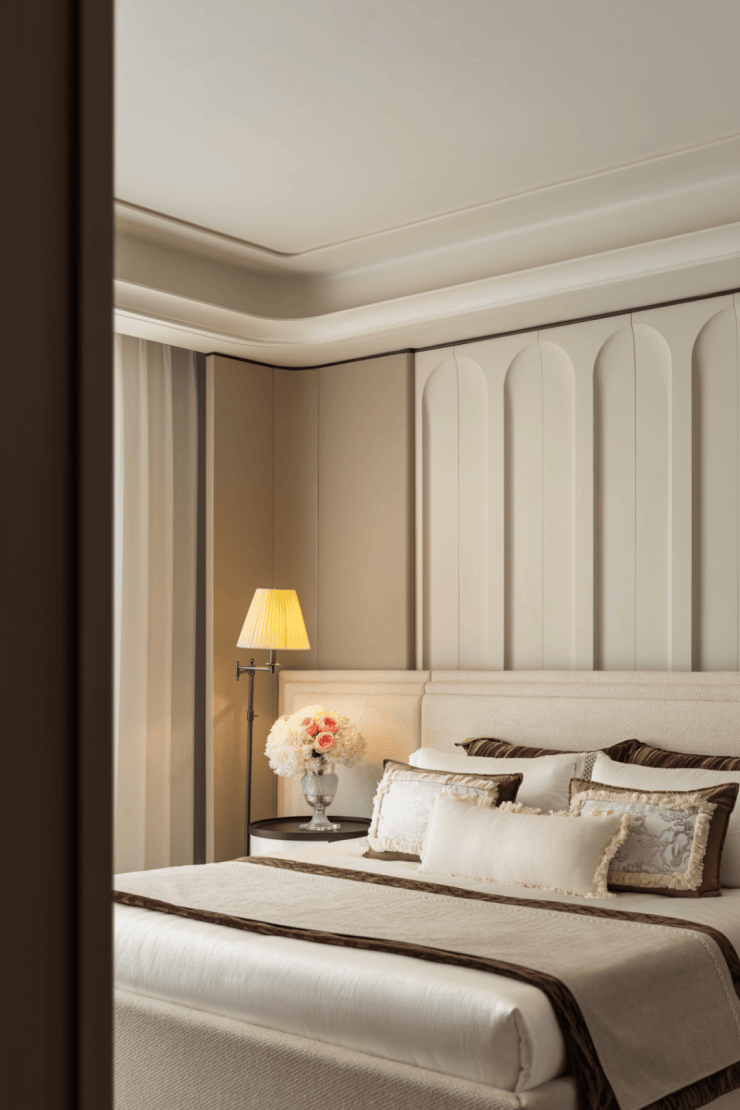 天花板为法式的圆弧设计,墙面背景为中式的沉稳大气,不同细节的组合方式彰显治秩序,也融入不同文化精髓。