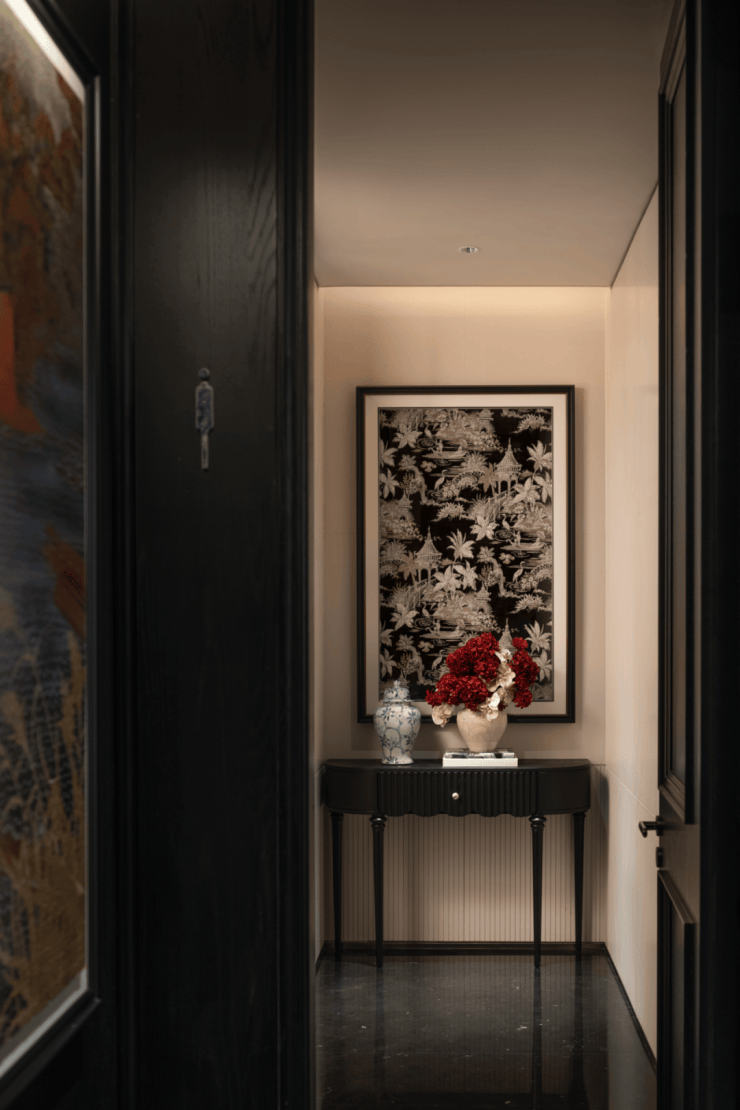 法式的雕花赋予白色墙面层次美感,中式的黑色描绘着山水大作,也融入海派风格。这不是简单的黑白碰撞,而是艺术的交流。