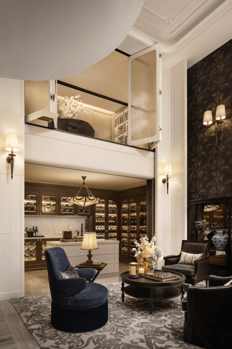 名贵的美酒整齐摆放在收纳架内,实木和金属元素搭配,营造出奢华气息。美酒的尊贵感也成为艺术的元素,呈现出生活品质。