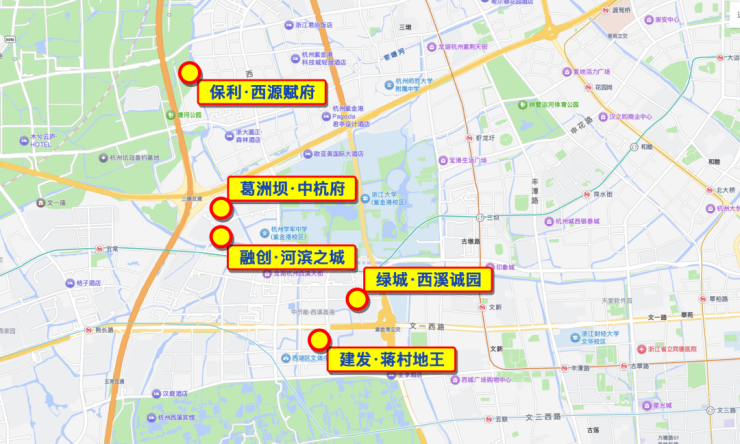 从保利·西源赋府出发,驾车从振华路转西园路,约10分钟左右即达浙大紫金港西门和学军中学紫金港校区,再往南500米就是西溪天街和西溪银泰。另外,项目往东走振中路,同样10分钟左右车程即达紫荆天街。
