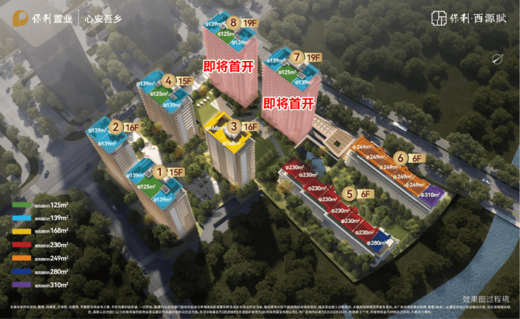 保利·西源赋府规划6幢15-19F高层+2幢叠墅,高层位于地块西侧,户型面积约125-168㎡,叠墅位于东侧邻河道,户型面积约230-310㎡。