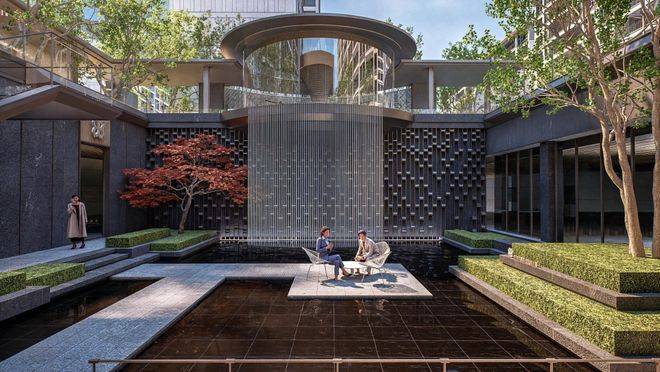 循着潺潺流水声,移步至「深涧花潭」。花语天著通过艺术化的处理手法,利用地形高差,将此处打造成上下连通的下沉式花园,自上而下,自下而上,360°处处可观景。这里更是一座轻松、灵动的社区会客厅,居者可尊享景观秘境,亦可与邻里、友人交流互动。