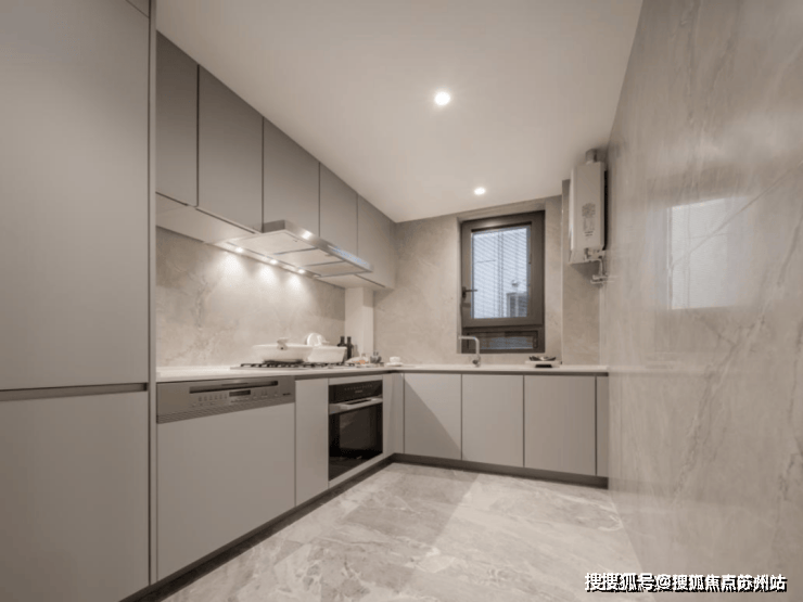 再看关键的厨房,大大的LOGO显示着——全进口的米勒6件套是没跑的,油烟机、灶台、蒸烤一体机、洗碗机还有单门的冰箱。