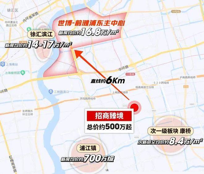 而以前滩、世博为中心,画三个直线约5-7km的生活圈,招商臻境是唯一一个约500万起的新房,而其他的选择,总价起码千万起。