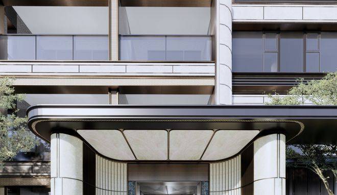 立面建筑上,招商臻境转译武康大楼和绿房子的曲线,设计了微弧阳台。首三层设置了贝金米黄石材基座,层间运用银白色和仿木纹色金属装饰线条,顶部设计了干净利落的玻璃塔冠。提升的窗地比和种种材料交织融合成独属于现代海派臻系的立面特色。