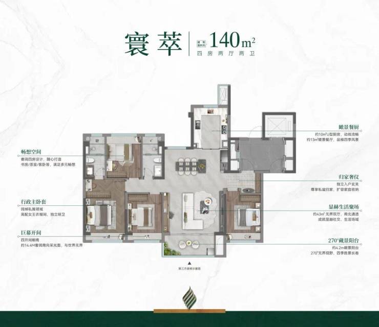 超配洋房140㎡,约14.4m南向采光面+约43㎡ 无界方厅+奢阔四房+一线家装品牌,空间王者,让每位家人都是VIP。