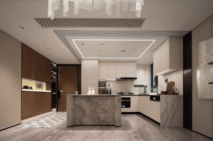 走进海上·清和玺的厨房,墙面岩板通铺,视觉效果超棒。