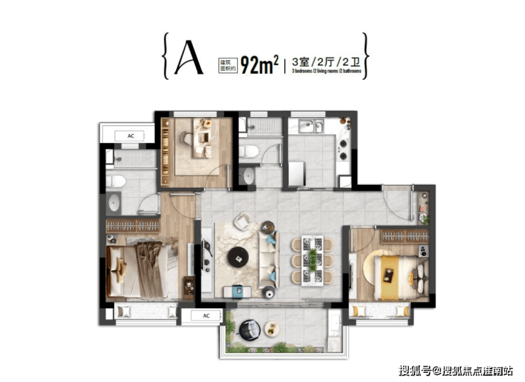 建面约92㎡的3房户型,实现了三开间朝南的格局,采用飞机户型的设计。厨房+餐厅+客厅+大面积观景阳台一体化,公区连成一线,尺度感和空间感更胜一筹。进一步观察细节,独立的玄关设计、客卫干湿分离,皆是更高利用率的设计。
