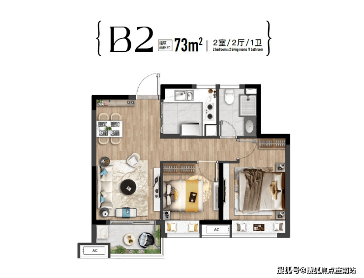 建面约73㎡的2房户型,南北通透且三开间朝南,约9米南向面宽,保证了室内的采光和通风;主卧不仅贴心地预留衣帽空间,而且卧室都带有飘窗,在室内也能拥有优秀的景观视野。