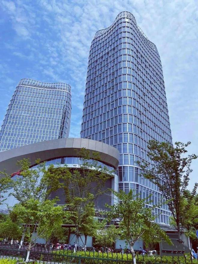 金属平纹屏凸显了塔楼顶部,这个金属屏形成的双曲塔冠,延续了塔楼的整体语言。塔冠的折叠造型使两座塔楼在杭州的天际线上形成独特的剪影。塔楼底部采用锥形造型,使其能够穿过商业裙楼,打造生长挺拔的造型。