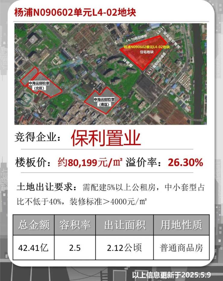 除了惊喜连连的青浦印象青城、以及已经华丽登场的新品保利海上印,上个月在上海四批次土拍中, 保利置业经过72轮激烈竞价,豪掷42.4亿,拿下杨浦区定海社区N090602单元L4-02地块,溢价率26.3%。
