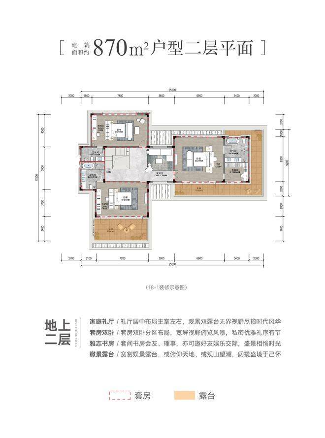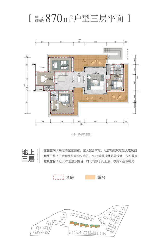 产品稀缺:仅87户,户型含340㎡四居、870㎡七居等,现房交付。