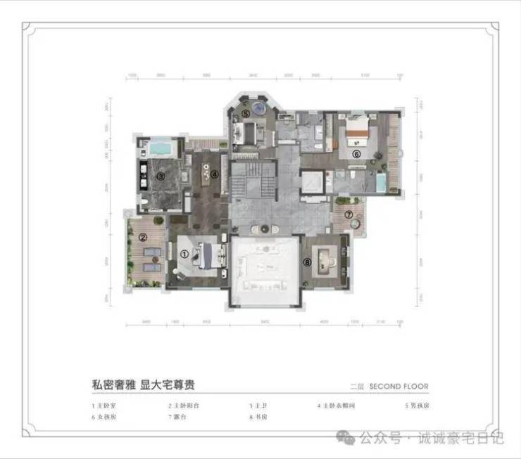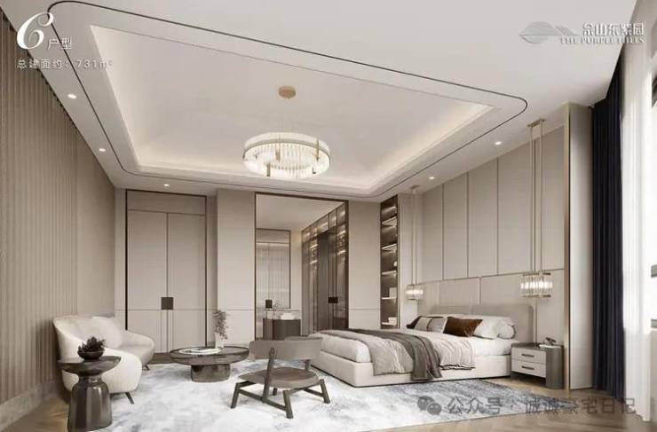 卧室配置更衣室、卫生间及阳台。主卧更显奢华,独立书房及步入式衣帽间诠释由内而外的儒雅气质,开阔露台留给诗和花的自由空间。