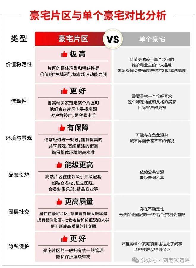 在价值稳定性、流动性、环境与景观、配套设施、圈层、隐私等维度,小胖君做了两者的对比,供大家参考: