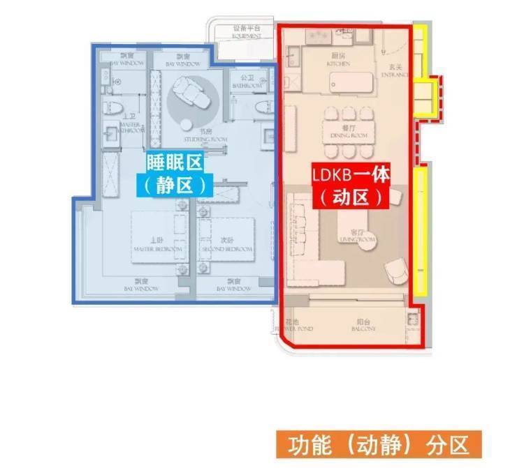 这个户型的动、静分区非常明确,几乎各占一半,用 “泾渭分明” 形容一点不为过。 动区采用了LDKB一体化的设计,视线一览无余。(如下图)