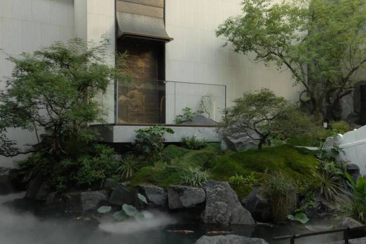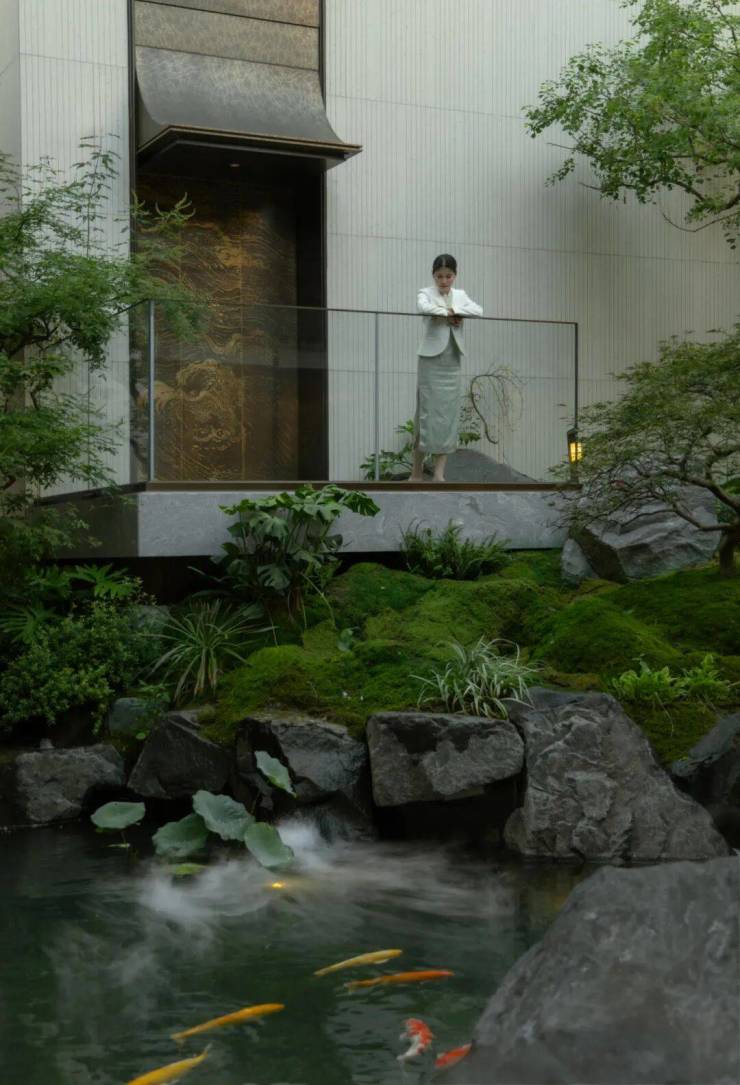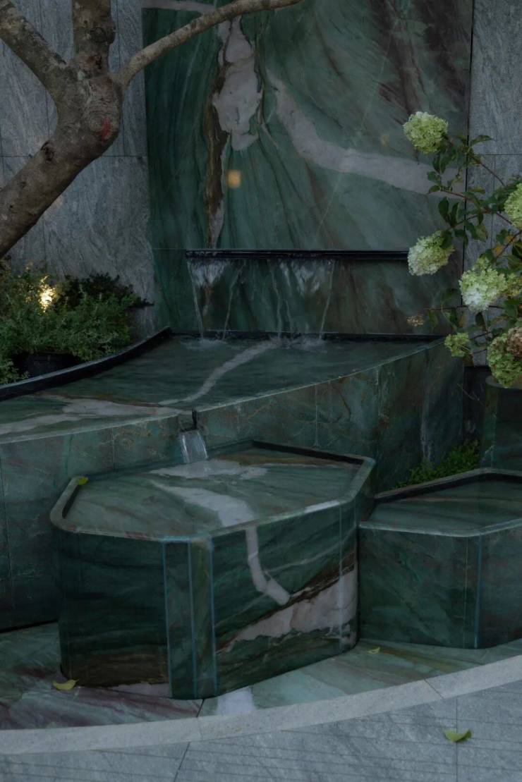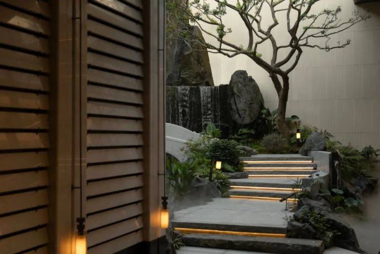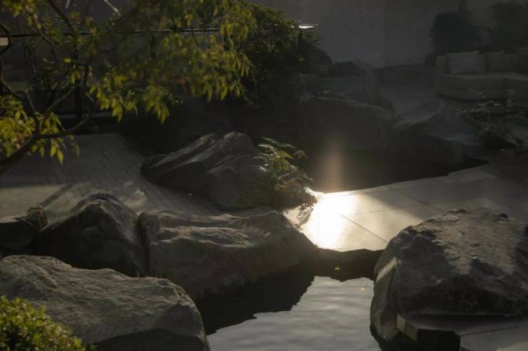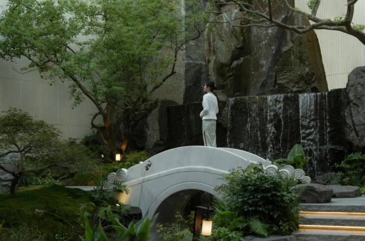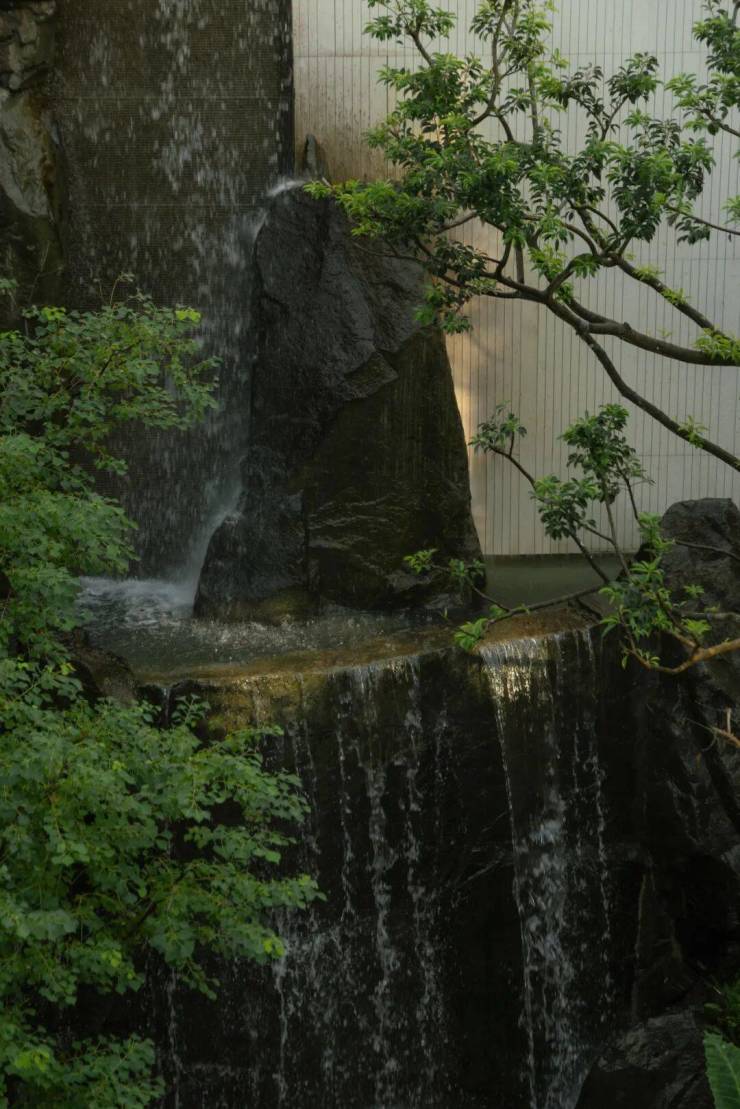 水自山出,叠石造山作为视觉焦点,同时以水声覆盖城市噪音,创造“山深不知处”的沉浸感.