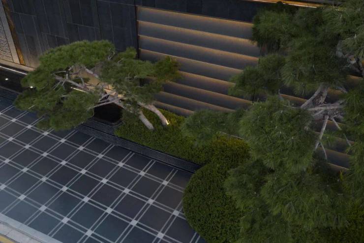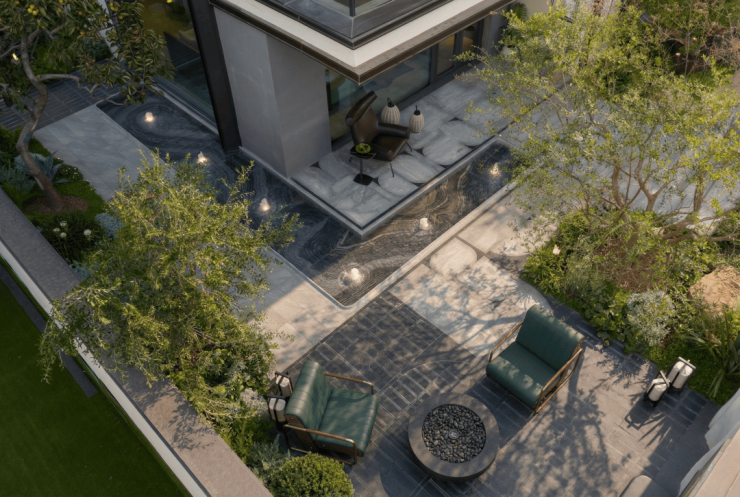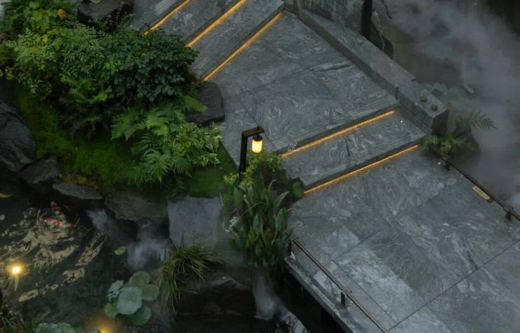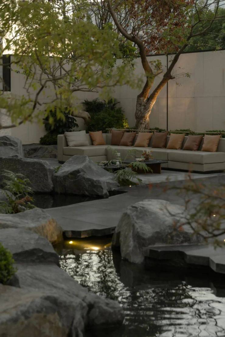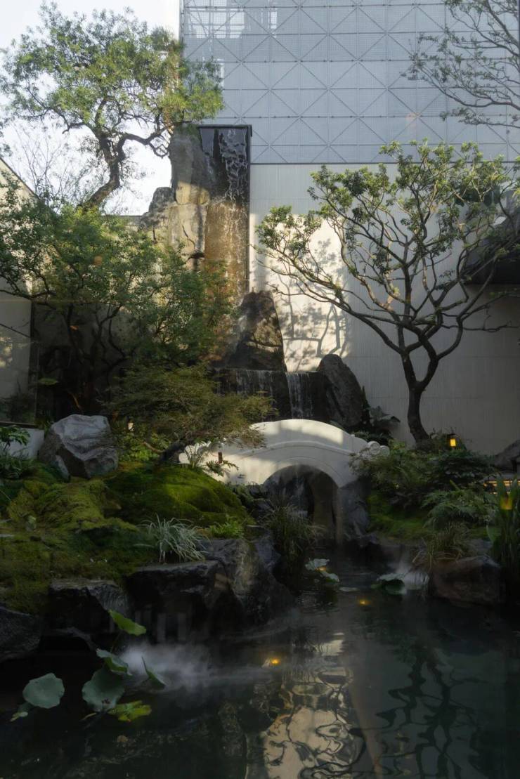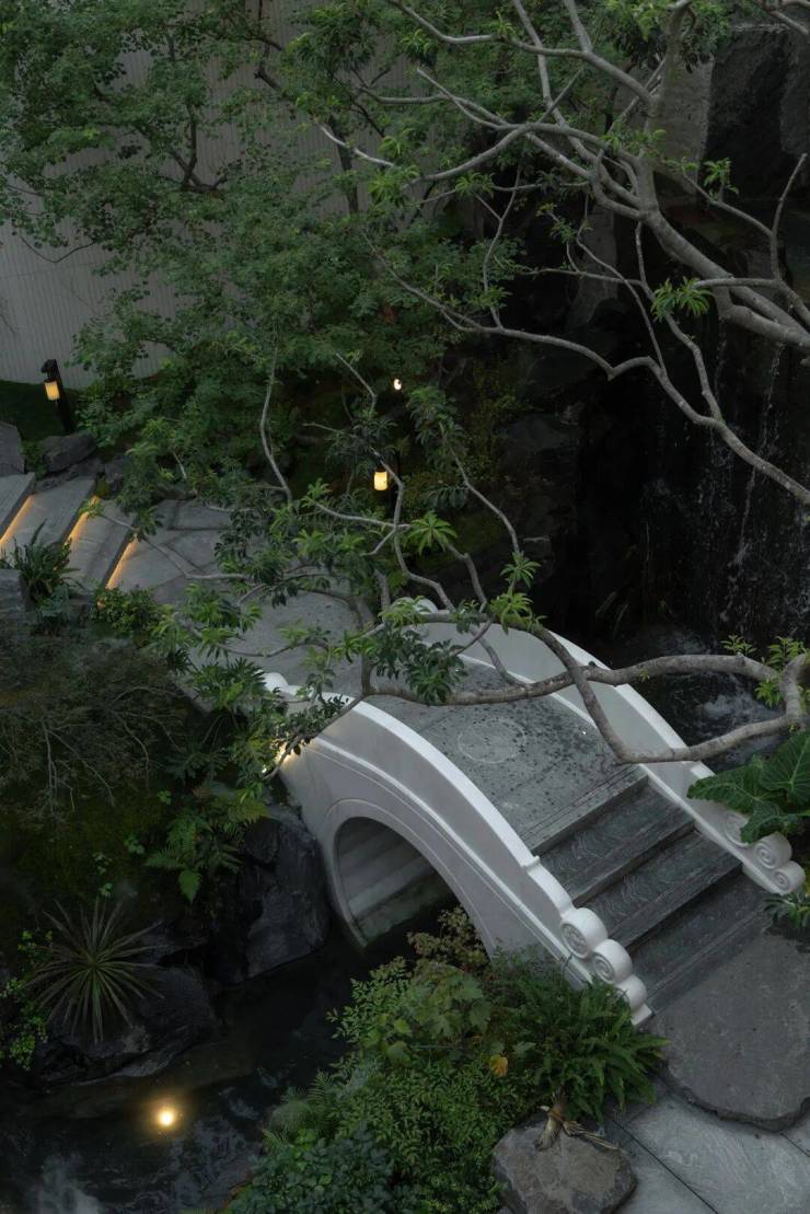 以苏州园林“咫尺山林”的造园哲学为灵感,通过山石、流水、拱桥、平台的起承转合,再现《林泉高致》中“可行、可望、可游、可居”的山水画境,打造“一桥渡云影,一石藏洞天”的诗意栖居。