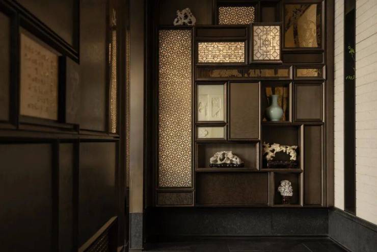 由一方天地转换至玲珑廊;廊下空间将苏州园林的“玲珑剔透”与“多宝荟萃”转化为空间语言。