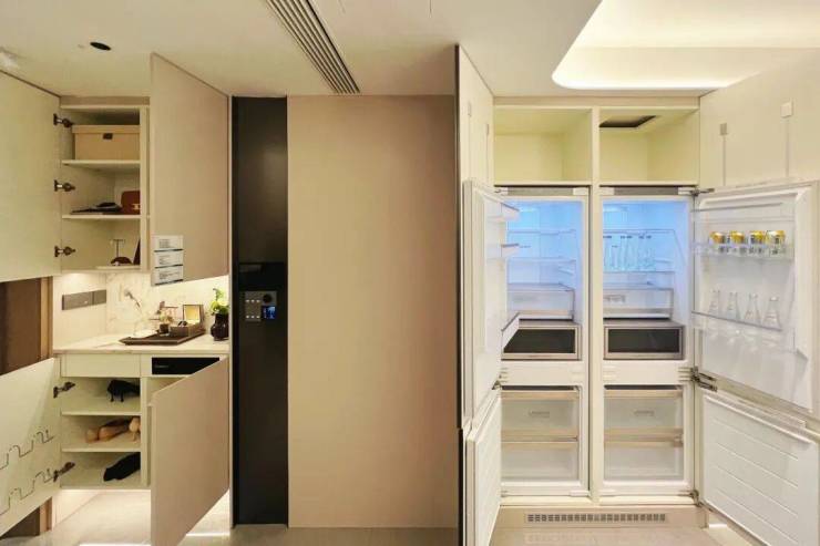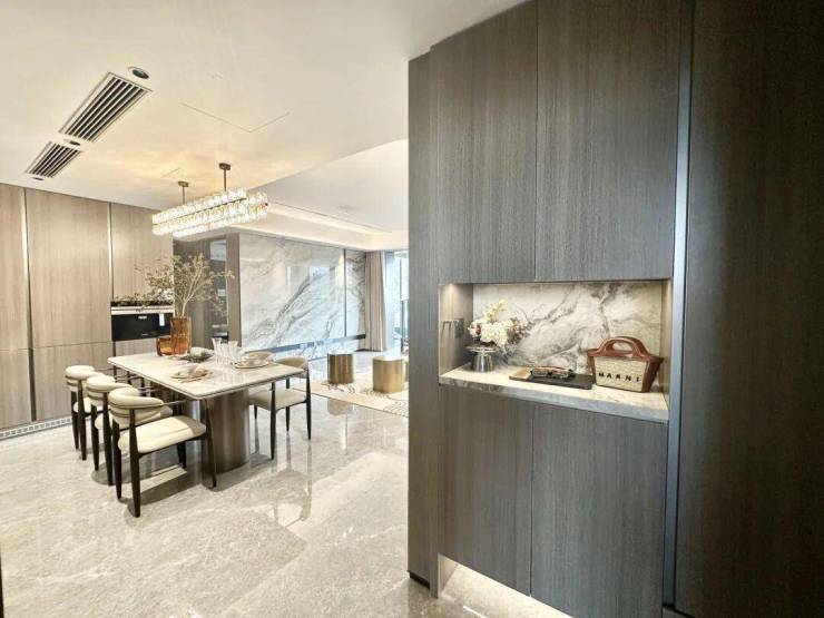 厨电配置方太的顶配系列:上方送风下方吸油烟的空调油烟机、灶蒸烤一体机;客厅配置内嵌式卡萨帝双拼冰箱;客厅大理石岩板电视背景墙面、弧形吊顶均为交付标准;