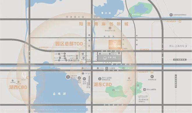 约3KM坐拥金鸡湖CBD精华配套,约500M星湖街,约1.5KM可达园区站“十字型”城际铁路枢纽、地铁及跨城轨交的TOD。