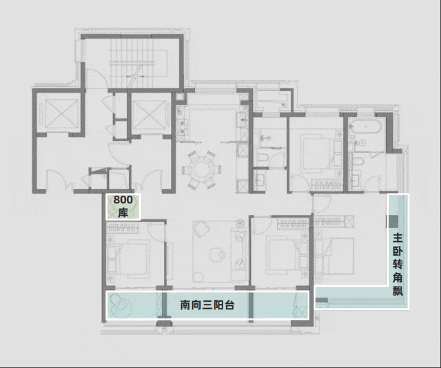 此外,业主也同样可以选择将双南向阳台打通,形成“跑道阳台”,观景与家政分开,兼顾功能与情绪价值。