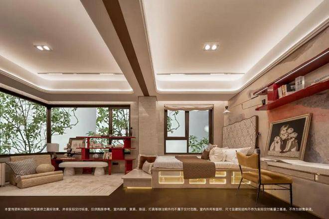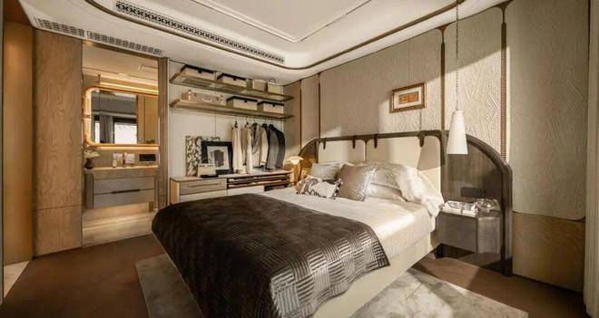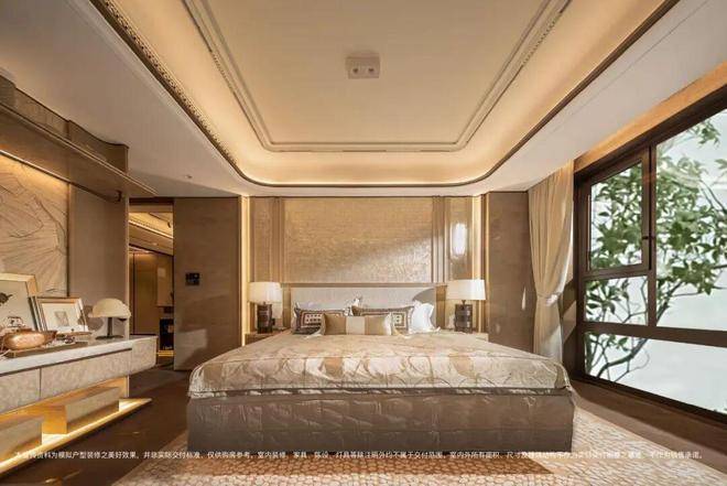 The master bedroom is equipped with a large background wall of about 4.6 meters in width, made of beaded mosaics and leather, in an arc shape. The floor adopts the copper-inlaid lotus leaf pattern floor tiles of the same style as those of Poly's Expo Tianyue, and the copper pattern can be chosen.