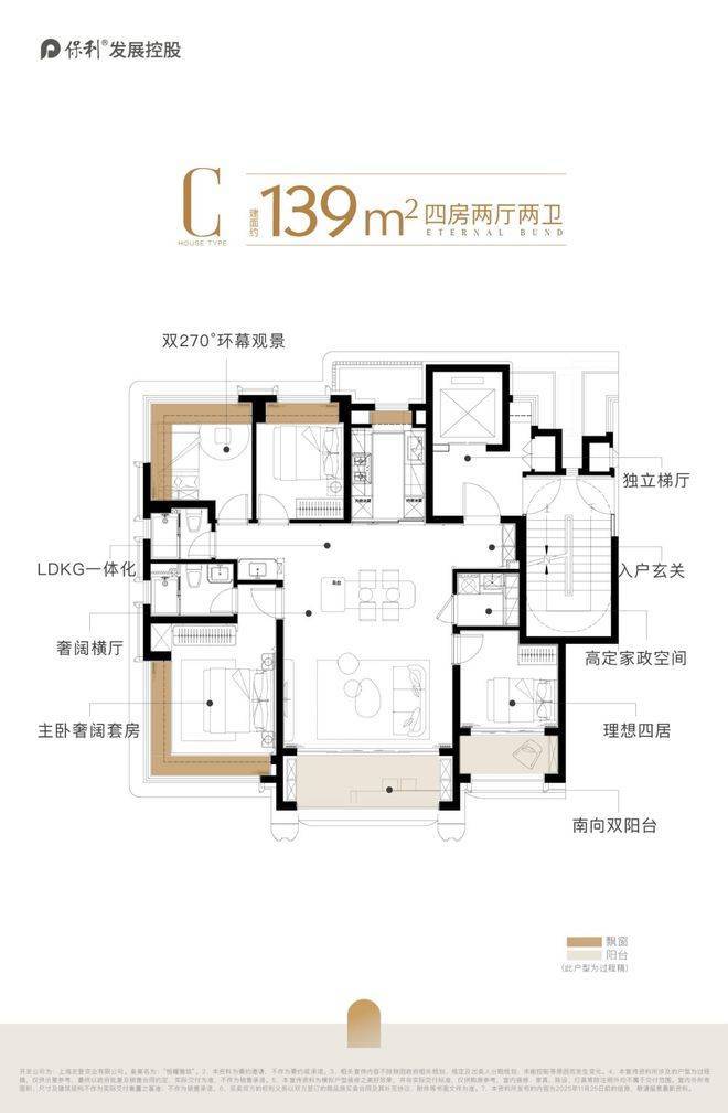 该户型围绕居住需求打造,规划类一梯一户、LDKB一体化横厅、双270°环幕视野等设计。
