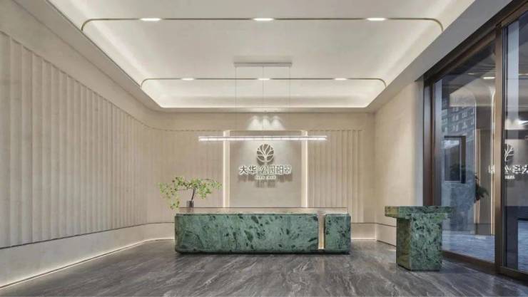 大堂接待台选用产自 意大利山脉的宝格绿奢石一体打造而成。